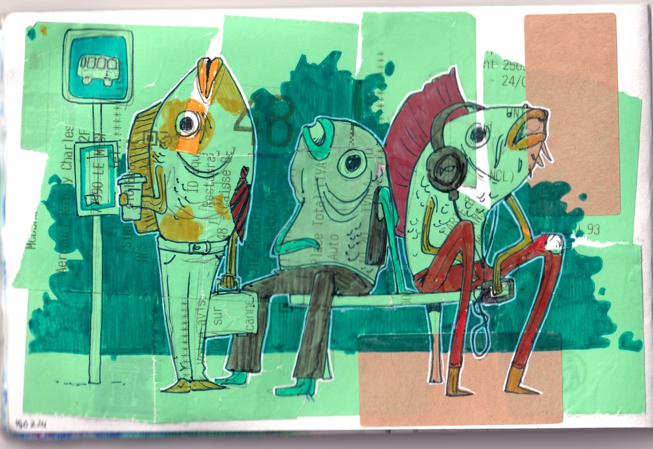 Still trying to finish some old sketchbooks, not quite there yet but I’ve had some additions I’m quite happy about, like these fishies mermaids waiting for the bus. There are some funny accidental blurs due to last month’s accidental soak.