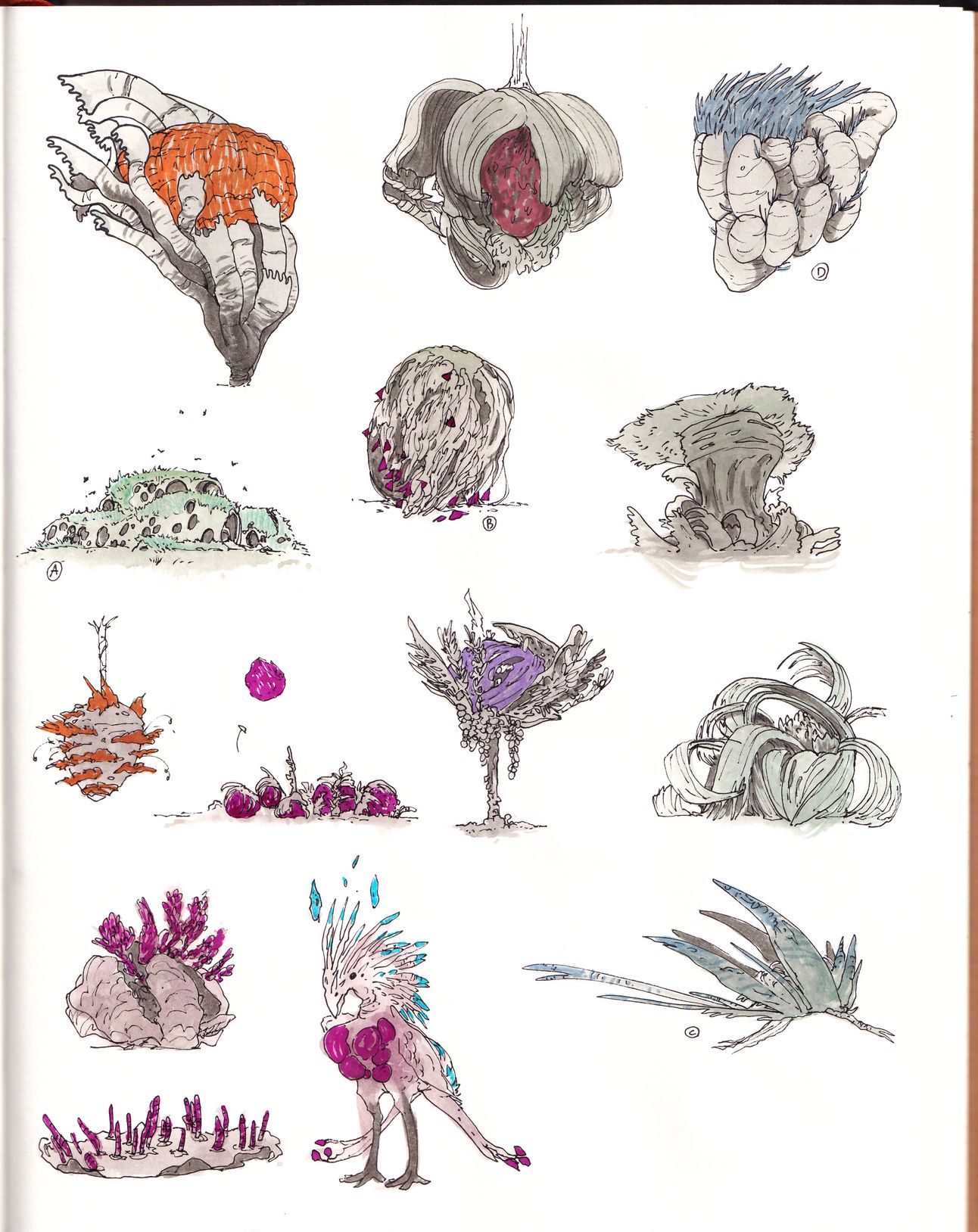 One of the main elements of the planet these life forms would be inhabiting is a two season climate, with regular floods in the first area we’re focusing on, leading to a lot of symbiotic life forms to allow different species to close up and resist the harshness of elements. Similar to these trees that I whipped up during the winter, bending and developing some protection against the intense storms one of the seasons brings.